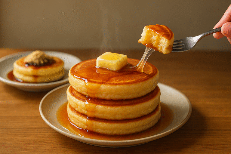 まず食感。名前負けせず、しっかりもちもちです。噛むほどに弾力が戻り、パンケーキというより“やわらかい餅とケーキの中間”のような不思議な満足感。甘さはほどよく、バターやシロップを合わせてもくどくありません。小麦の香りがはっきりしていて、冷めてもパサつきにくいのが好印象。焼きたては外側さくっ・中むちっ、時間がたつと全体がしっとりに寄っていくので、どちらの表情も楽しめます。
