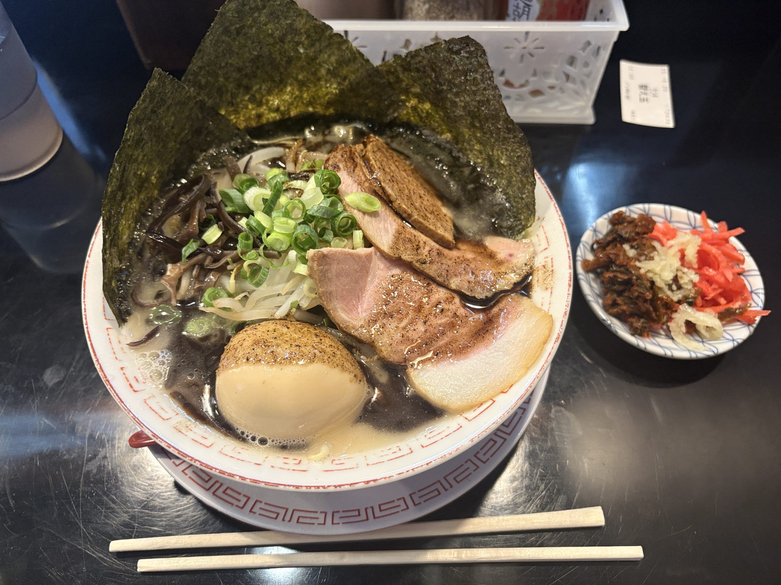 実はこのお店に来るのは今回が初めてではなく、長期の出張の間にすでに5回ほど足を運んでいます。普段ラーメンをほとんど食べない私が、同じお店にこれだけ通っているのは本当に珍しいことです。それだけ「マー油豚骨ラーメン」が自分の口に合ったのだと思います。
